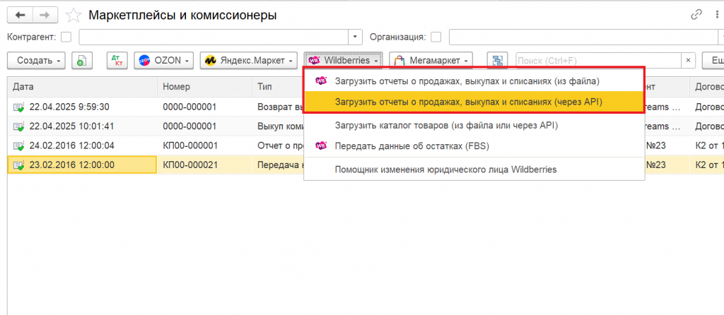В разделе «Продажи» «Маркетплейсы и комиссионеры» появятся новые документы.