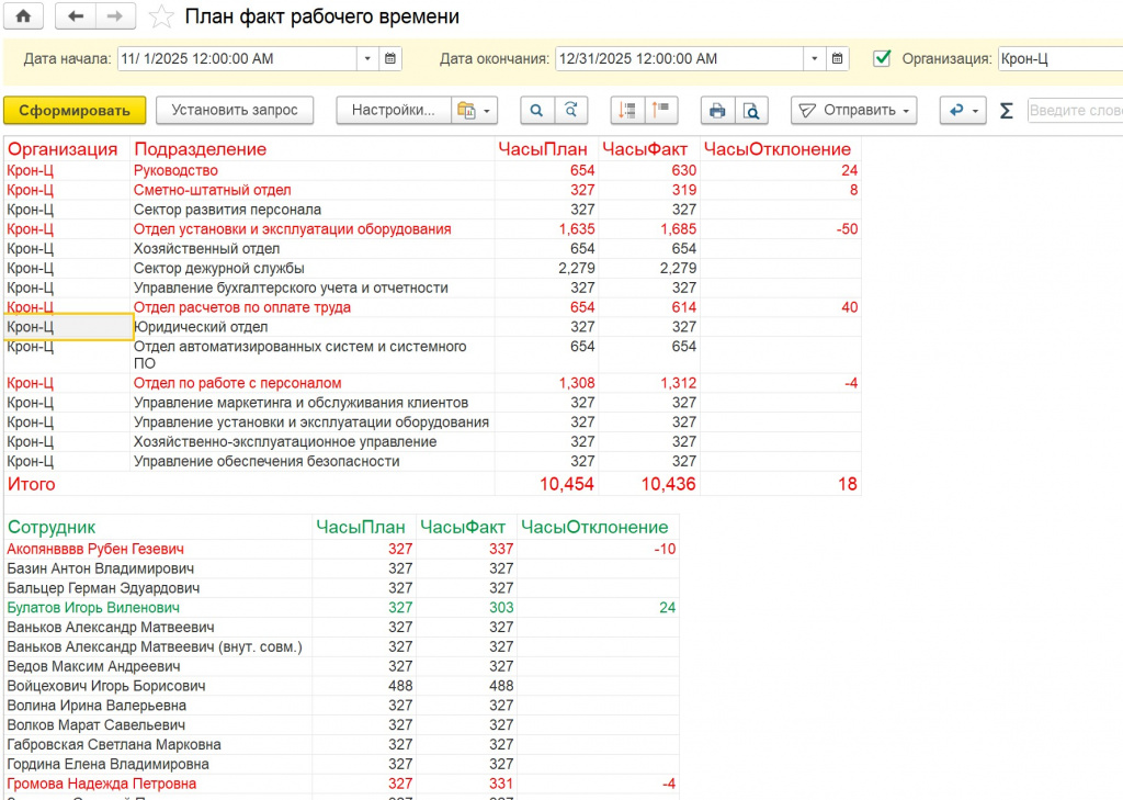 После объединения плановых и фактических данных выполняется привязка к кадровым периодам сотрудников. Это позволяет корректно анализировать рабочее время в разрезе подразделений, должностей и позиций штатного расписания с учётом кадровых изменений.