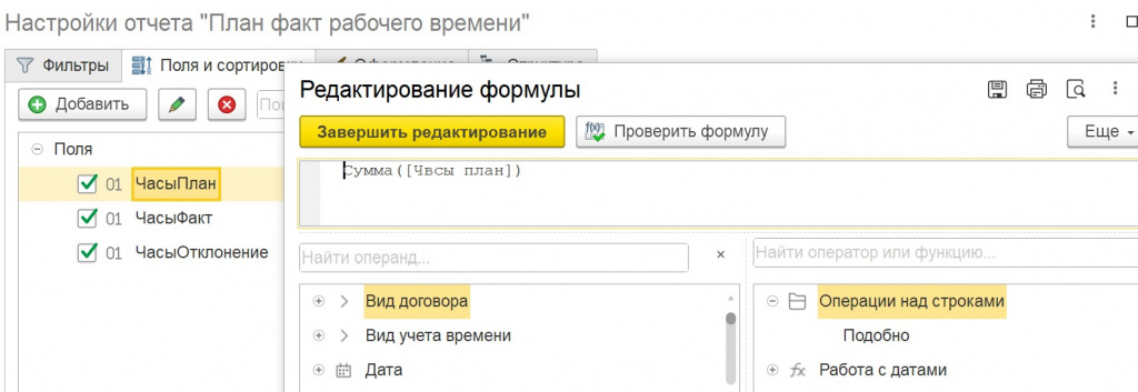 Так как отчёт должен рассчитывать итоговые значения по группировкам, добавим пользовательские поля через механизм формул.