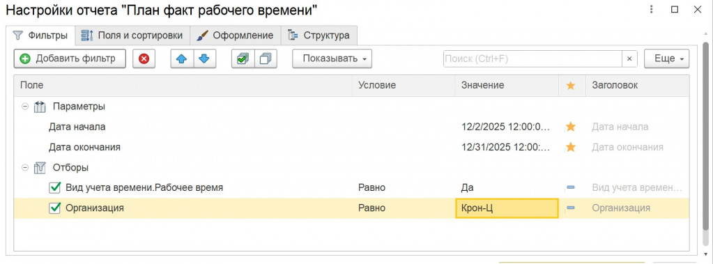 В результате мы получили полноценный отчёт для план-фактного анализа рабочего времени с отклонениями по часам (и при необходимости — по дням), с гибкими разрезами (сотрудник, подразделение, должность/позиция штатного расписания) и стандартными возможностями СКД: отборами, группировками, пользовательскими формулами и оформлением.