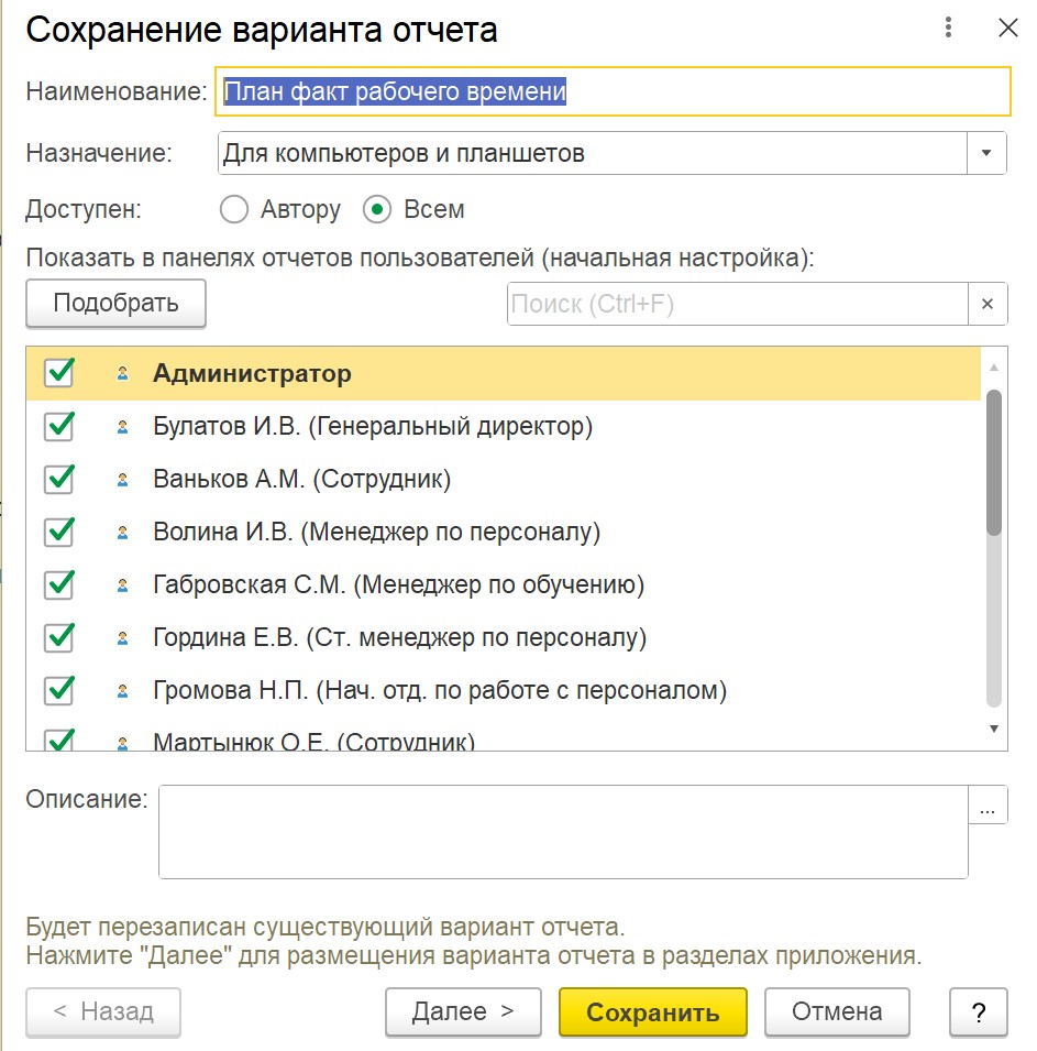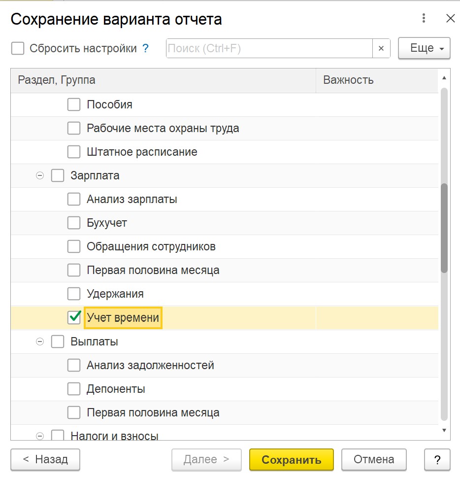 После настройки запроса и СКД отчёт можно сохранить типовым механизмом вариантов отчётов. При сохранении мы задаём наименование, настраиваем доступность (только автору или всем пользователям) и при необходимости выбираем, кому показать отчёт в панелях. Далее вариант можно разместить в нужных разделах приложения (например, «Учёт времени»), чтобы пользователи находили отчёт в привычном месте и использовали его как обычный типовой отчёт.