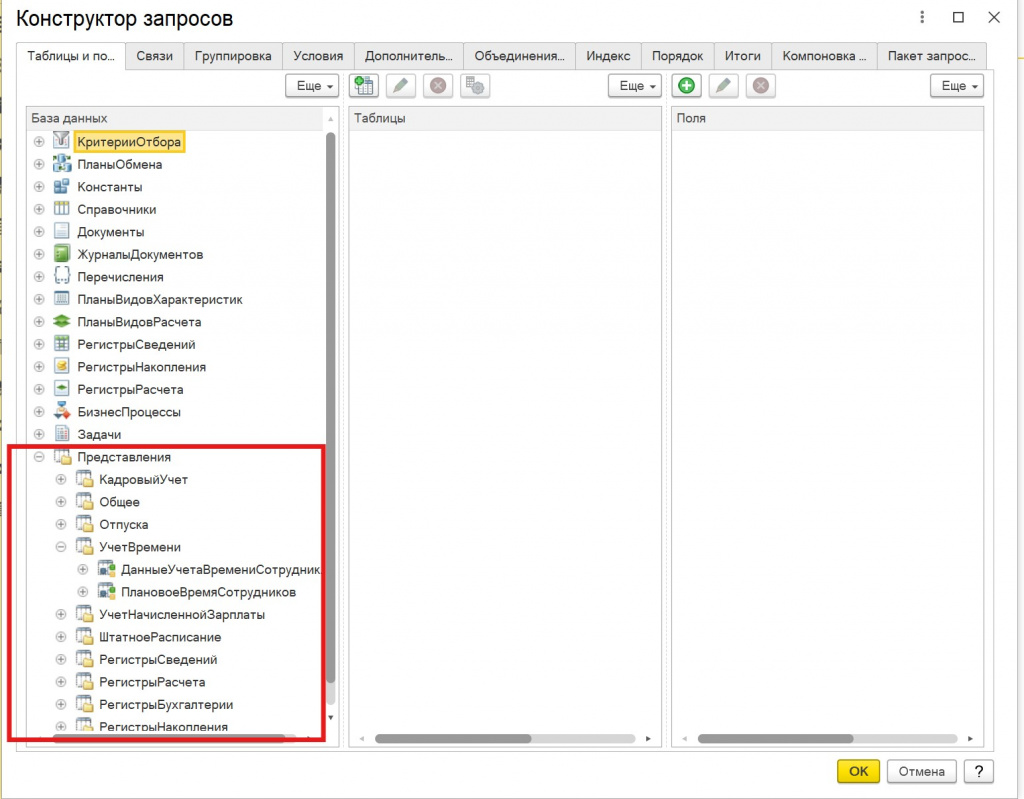 С точки зрения конструктора они выглядят как обычные источники данных, однако по своей сути являются аналогом виртуальных таблиц, позволяющими получить доступ к программному интерфейсу ЗУП.