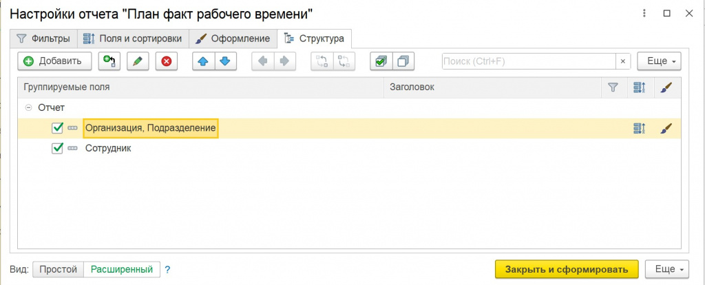 На завершающем этапе настраивается структура отчёта — группировки и порядок вывода данных.