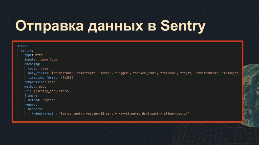 И последний кейс, который я хочу показать – отправка ошибок в Sentry. Вы читаете журнал регистрации, получаете информацию об ошибках и сразу же через Vector отправляете их в Sentry.