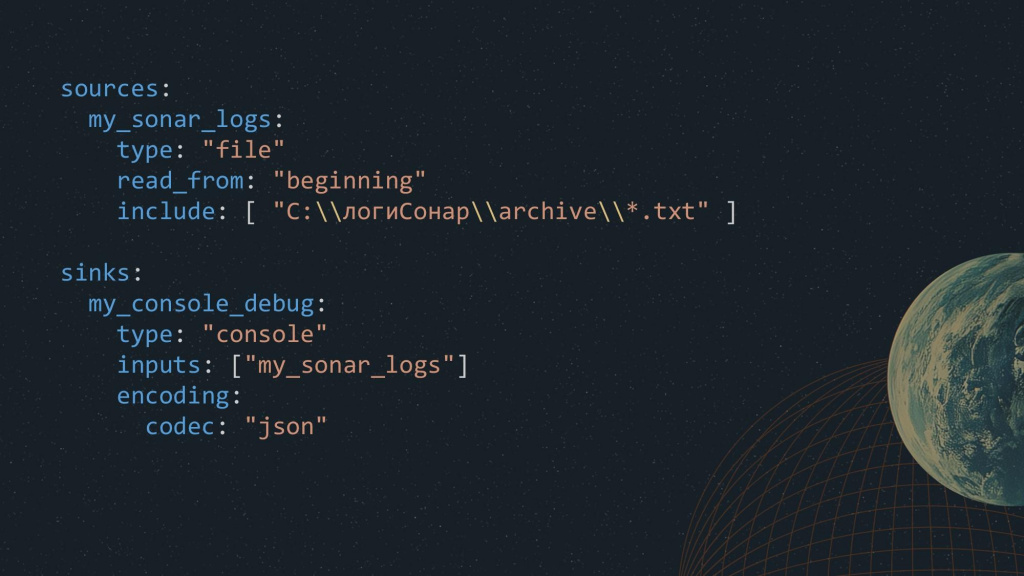 Всю эту информацию мы оборачиваем в произвольное имя источника – в данном случае, в блок my_sonar_logs. Это наименование можно выбрать любым и затем использовать дальше при построении пайплайна обработки. В дальнейшем я как раз покажу, как мы к нему обращаемся.