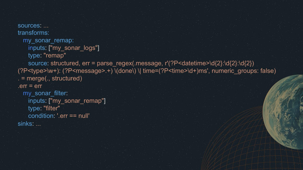 В самом простом варианте мы добавляем блок с типом «remap», внутри которого можно использовать инструкции на специальном языке VRL (Vector Remap Language). В этом языке предусмотрено множество встроенных функций, которые работают очень быстро, поскольку реализованы на Rust. С их помощью можно выполнять разбор строк по регулярным выражениям, группировать данные, преобразовывать поля, выполнять различные логические операции и многое другое. Если какой-то функциональности вам не хватает, ее можно запросить у разработчиков Vector – новые возможности довольно оперативно добавляются и также реализуются на Rust.