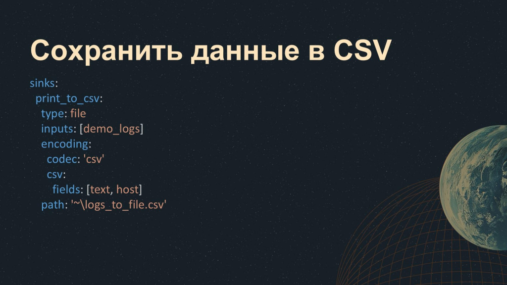 Самый распространенный вариант для продуктива – это запись в другой файл. Vector может трансформировать данные и сохранять их в другом формате: JSON, CSV, XML и многие другие форматы «из коробки». Никаких сложных настроек не требуется – достаточно просто указать, куда записывать.
