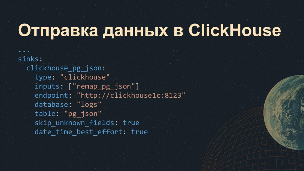 Далее – отправка данных в хранилище. Например, в ClickHouse. Здесь настройки следующие: