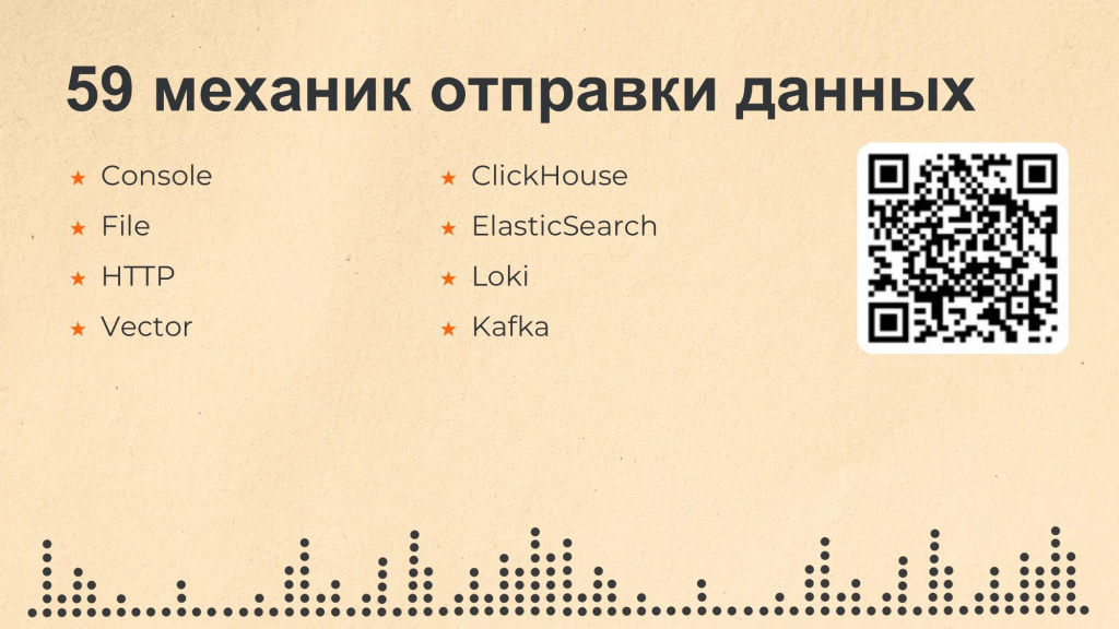 И, конечно, Vector поддерживает отправку данных в стандартные хранилища логов – такие, как Clickhouse, Elasticsearch, OpenSearch, Loki и другие популярные решения.