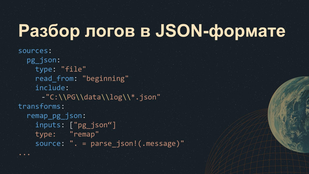 Рассмотрим, как этот пример логов можно разобрать с помощью Vector.