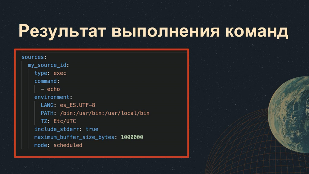 Еще один пример – использование для получения данных механизма «exec». Он позволяет выполнять в системе произвольные команды, а результат их выполнения передавать на вход следующих шагов в Vector.