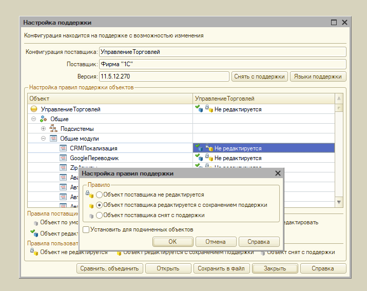 5. А вот теперь самое забавное: если отменить захват корня конфигурации, то он будет заново получен из хранилища, где режим поддержки будет изначальным не редактируется. При этом наш код останется на месте