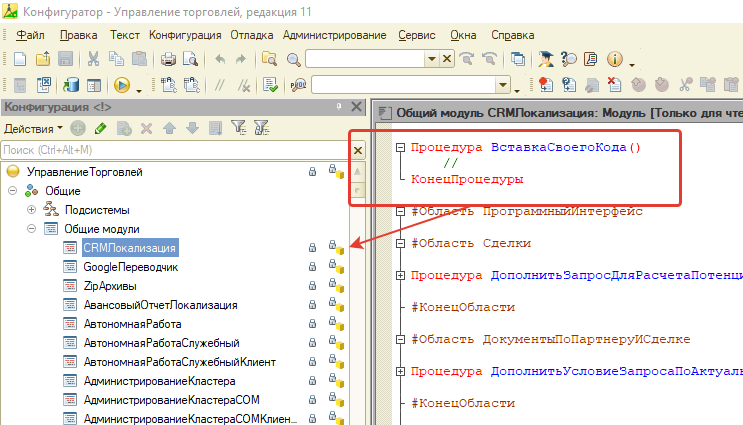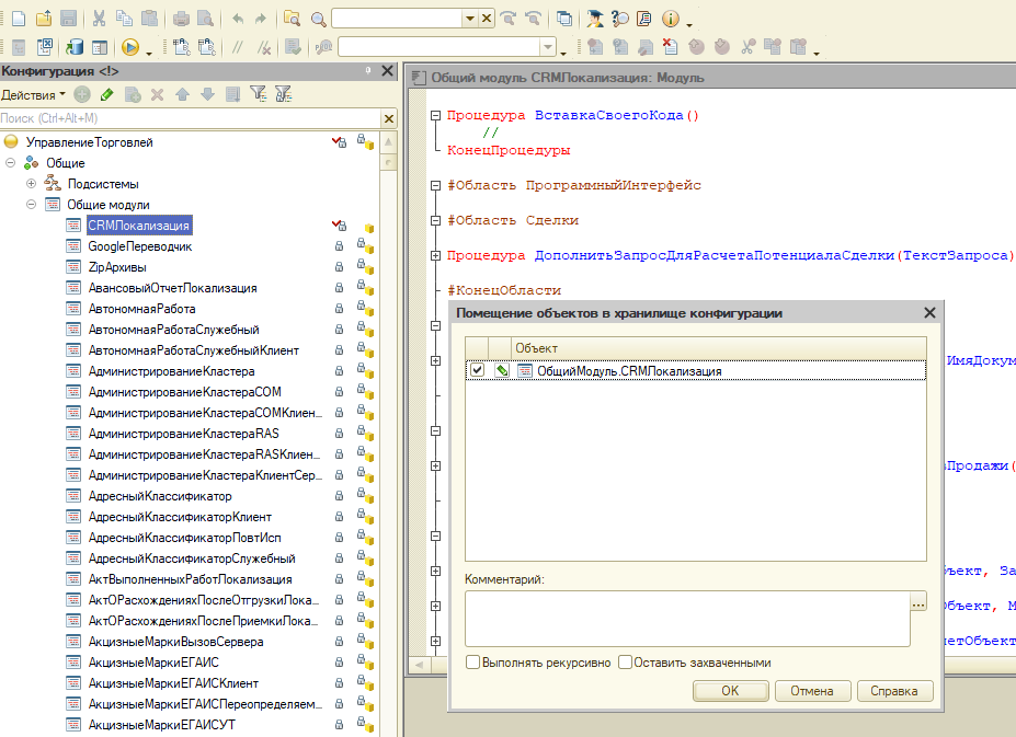 4. После этого вносим необходимые изменения в код (в данном случае для примера добавлена процедура ВставкаСвоегоКода() и добавляем изменение в хранилище.