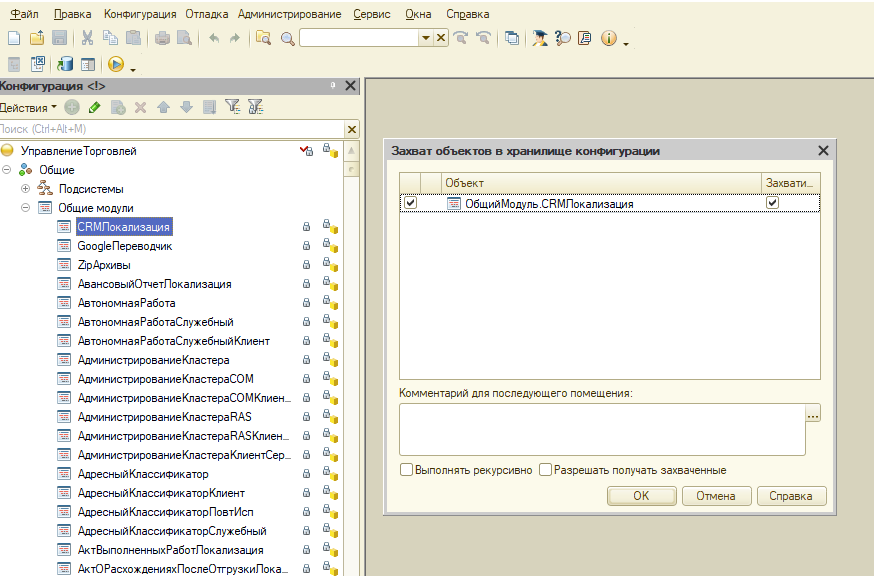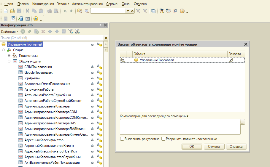 2. После подключения конфигурации к хранилищу надо захватить корень конфигурации (для временного включения возможности изменения объекта) и нужный нам объект для редактирования.