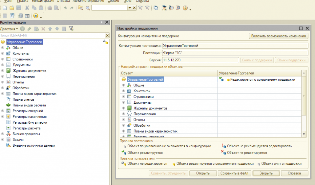 1. Открываем нужную конфигурацию и первым делом подключаем ее к хранилищу. В момент подключения система попросит включить возможность изменения.
