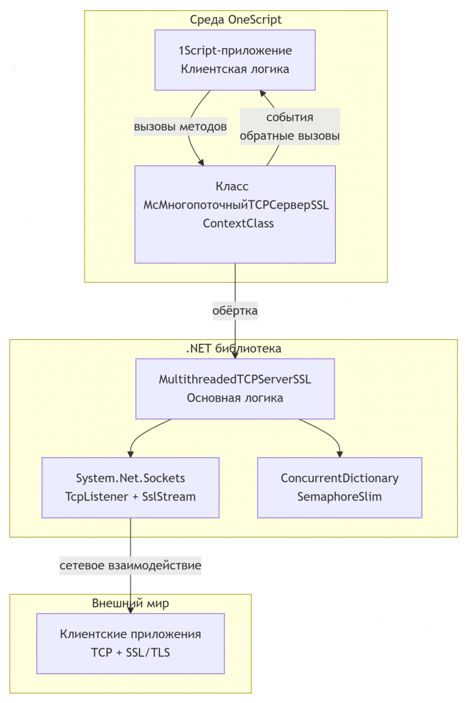 - Событийная модель удобная для интеграции с OneScript (подключение, отключение, получение данных, ошибки).