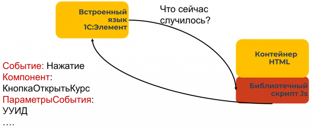 Однако есть проблема. В 1С:Элементе контейнер HTML не поддерживает обработку событий при нажатии – ни в каком варианте. Текущая реализация не позволяет получить обратную связь о том, что происходит внутри контейнера.