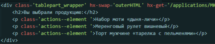 А вот так выглядит ответ от сервера с помощью htmx: мы сразу отдаем с сервера фрагмент HTML и используем атрибуты, через которые задается поведение. С их помощью можно сразу определить логику. Сервер становится всемогущим.