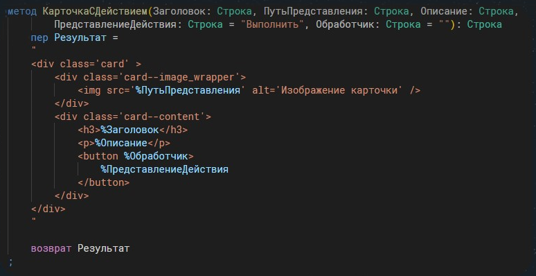 Код пишется просто. В 1С:Элемент это удобно благодаря интерполяции строк. Подсветки HTML в среде разработки нет, но подсветка переменных есть, и работать с этим удобно.