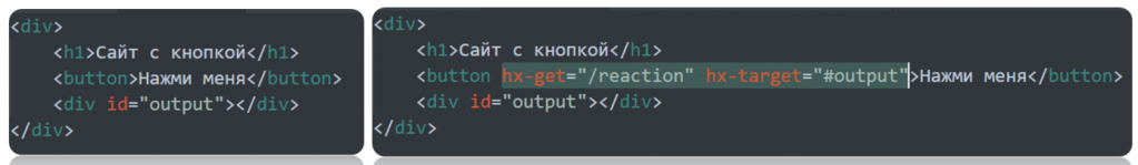 С htmx все проще: при нажатии на кнопку выполняется запрос по адресу, указанному в атрибуте hx-get. Этот атрибут встроен в htmx. Мы обращаемся к серверу, получаем от него фрагмент HTML, который возвращает веб-сервис, и вставляем этот фрагмент в страницу. За то, куда он вставляется, отвечает атрибут hx-target. По умолчанию содержимое ответа заменяет текущий тег, но это можно изменить, указав другой элемент в hx-target. В данном случае при нажатии на кнопку «Нажми меня» запрос идет по адресу /reaction, получает ответ от сервера и вставляет его в блок с идентификатором output. Этот идентификатор задан в hx-target. Это базовый принцип работы htmx.