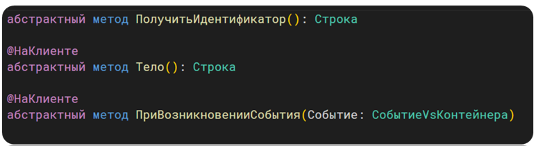 Как это выглядит с точки зрения прикладного разработчика: есть контракт, который называется VS-компонент. Этот контракт обязывает вас реализовать метод тела, который отвечает за рендер отдельно взятого компонента, и обязывает реализовать обработчик события, чтобы внутри этого события обрабатывать: нажали туда, перетащили то, создали то. И есть метод, который обязывает задать уникальный идентификатор для того или иного компонента, который реализует этот контракт. Реализацией контракта вы можете делать все, что угодно.