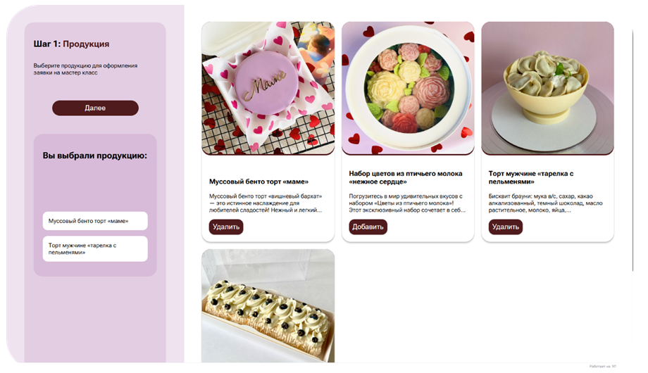 Первая – человек с улицы, не знакомый с 1С. Он заходит в приложение, оставляет заявки на мастер-классы, добавляет их в корзину, выбирает удобные даты и отправляет. Все это реализовано целиком на htmx – без единой строки JavaScript или какого-либо другого кода, кроме HTML и серверного кода 1С:Элемент.