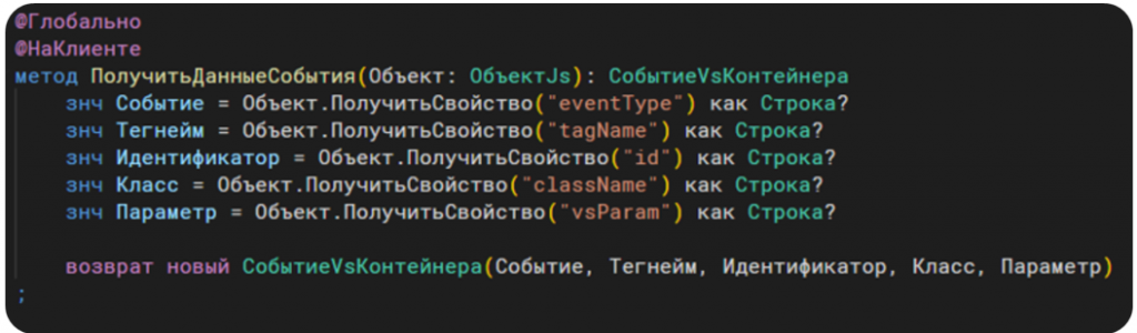 Выглядит это примерно так. Внутри объекта JavaScript, который лежит в контейнере HTML, есть какой-то ответ. Вы получаете информацию о самом событии, запаковываете это в человекочитаемую структуру на уже встроенном языке, чтобы в дальнейшем с этой структурой на клиенте или на сервере что-то делать.