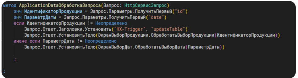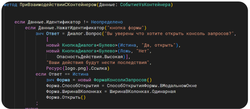 Для конечного разработчика на встроенном языке 1С:Элемент это выглядит просто: если нажата кнопка с определенным идентификатором – выполняется нужное действие. Цель такого подхода в том, чтобы можно было уйти из проекта, а 1С-разработчики могли без труда продолжать поддержку.