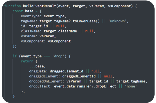Логика простая. Я договорился сам с собой, в каком виде буду возвращать информацию о событии: какого оно типа, с каким компонентом произошло, что нажали, куда нажали, что переместили, куда переместили, какие параметры были к нему прикреплены.
