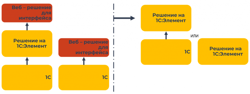 В идеале хочется, чтобы все выглядело как на правой схеме – реализовано средствами 1С:Элемента или полностью на самом Элементе, без привлечения внешних фреймворков. Такие кейсы уже есть: многие проекты успешно создаются только на Элементе, минуя 1С.
