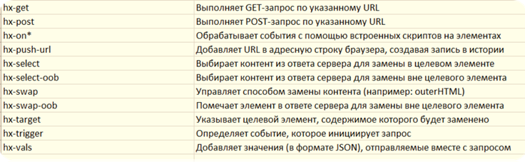 Помните шутку: «Какие языки программирования ты знаешь? – HTML, C#, CSS»? Так вот, теперь это уже не шутка. HTMX позволяет задавать поведение элементов через атрибуты тегов: что произойдет при их обновлении, по какому адресу получить нужные данные и куда встроить возвращенный фрагмент страницы.