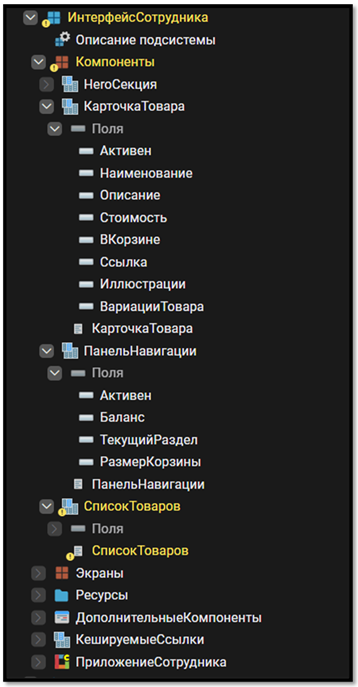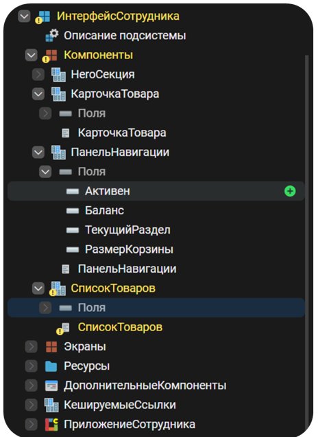 У меня в примере есть структура. Панель навигации – это отдельный компонент в моей библиотеке, фреймворке, где есть баланс, текущий раздел, размер корзины. Это все лежит на клиенте в специальной коллекции и сохраняет свое состояние.