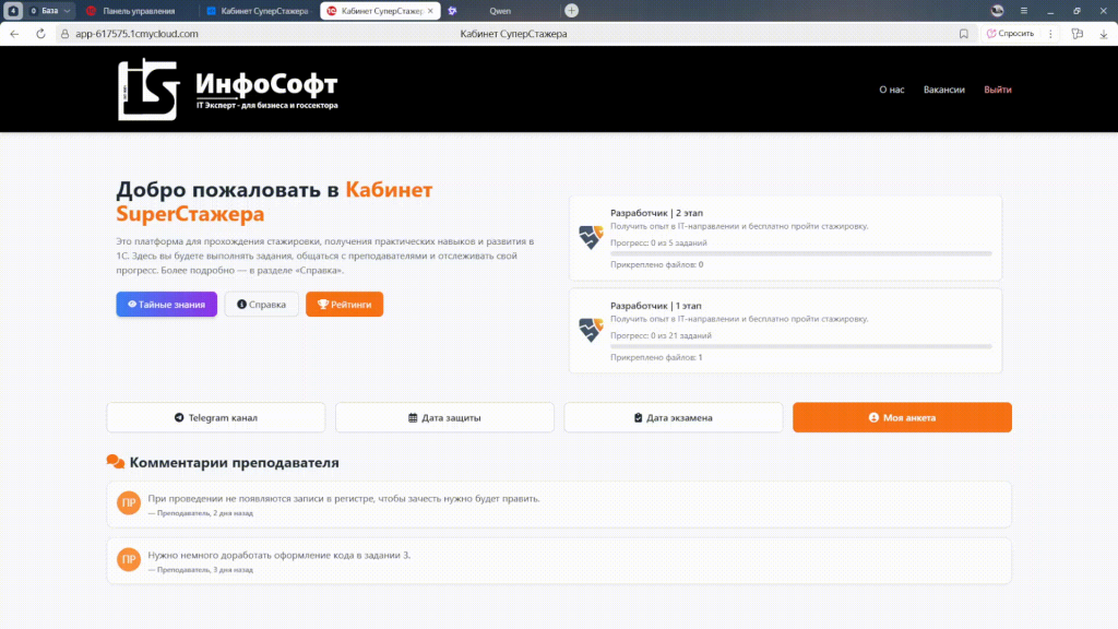Есть версия этого интерфейса, реализованная на Vs Ui, которую я тоже навайбкодил, оставаясь в экосистеме 1С:Элемент. Это платформа, где пользователи могут загружать задания, скачивать файлы, переписываться с преподавателями. Мы используем ее в основном для стажеров: они приходят на программу стажировки и через этот личный кабинет получают доступ к обучающим материалам.