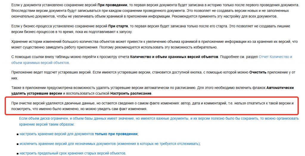 Очень помогло бы, если бы на форме настройки версий появилась бы декорация с пояснением работы механизма очистки. Что-то типа текста из документации.