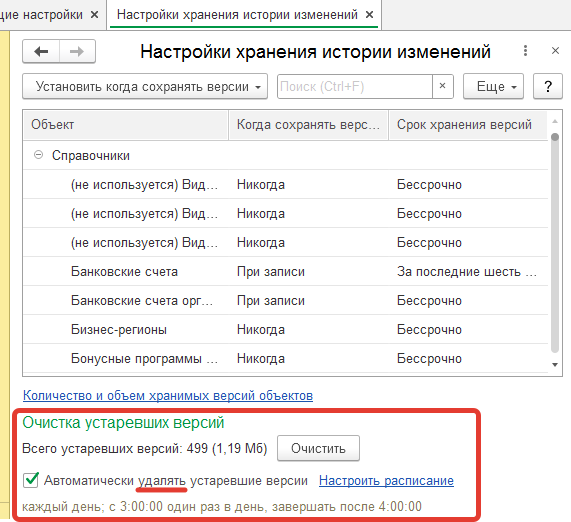 Не помогает в понимании того, что на самом деле происходит, и типовая форма настройки версий. Посмотрите, группа названа "Очистка устаревших версий", а флажок, управляющий включенностью регламента, называется "Автоматически удалять устаревшие версии".