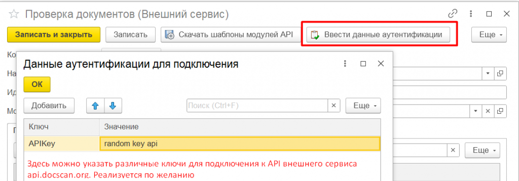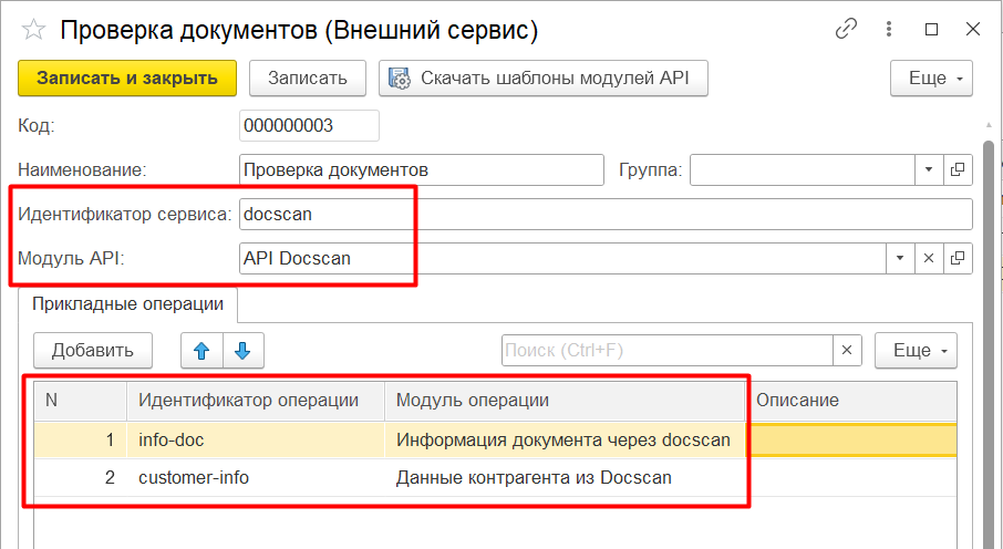 serviceIdURL входящего запроса. - Модуль API — внешняя обработка, созданная на шаге 1, которая содержит все вызовы методов API внешнего сервиса.