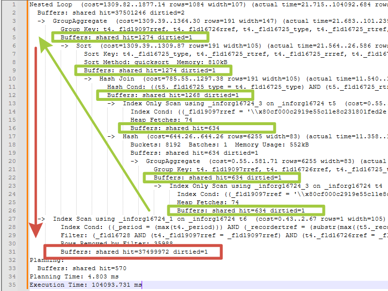 Здесь нужно обратить внимание, что запрос прочитал 37501246 страниц, из которых 99,997% приходится на один оператор. Давайте запрос выполним в тестовой базе с расшифровкой полей индекса и выбора. Далее уже будут планы только из тестовой базы, цифры будут отличаться, но проблема та же.