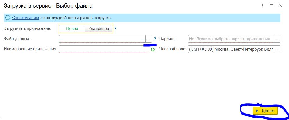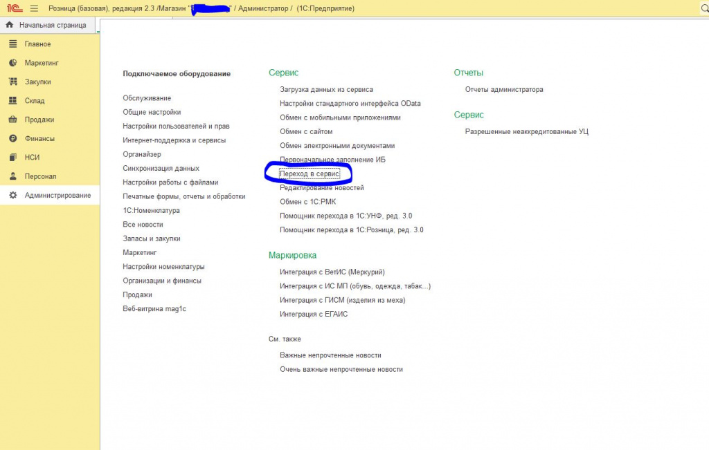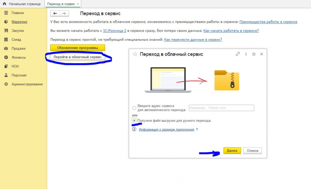 2) Выгружаем базовую версию для перехода в облачный сервис - так же, как и предидущий пункт, никаких сложностей не должно вызвать, т.к. это стандартный механизм, который запускается через меню Администрирование -> Переход в сервис -> Перейти в облачный сервис -> Получить файл выгрузки для ручного перехода -> Далее -> Режим ывгрузки полный -> Продолжить -> Программа производит выгрузку, нужно указать путь для выгружаемого файла (файл пригодится для пункта 4)