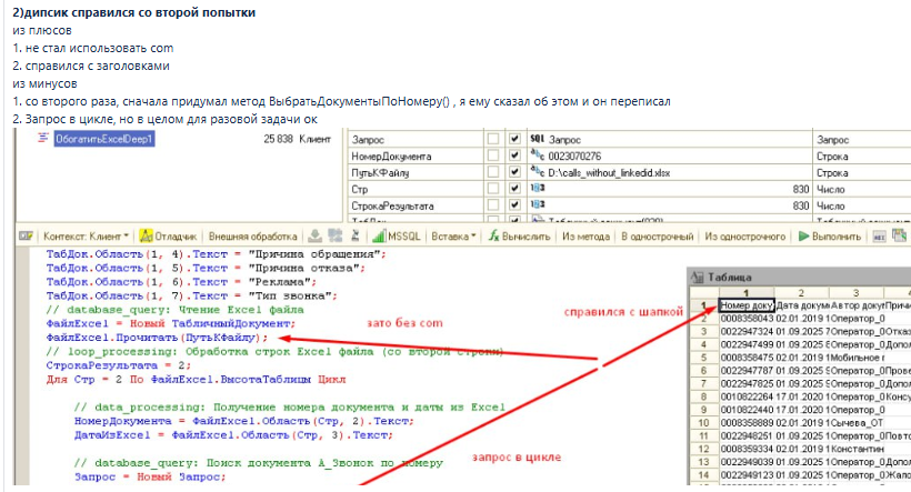 Для понимания структуры конфигурации, реквизитов объектов обязательно используй my-1c-mcp-server а для понимания синтаксиса языка 1С используй 1c-syntax-helper . Напиши код в файле ОбогатитьExcel.bsl . Телефон контрагента бери из регистра "Контактная информация ", документ ищи по дате и номеру.