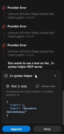 Syntax MCP: Подсказывает актуальный синтаксис языка 1С. Это критично для бесплатных моделей или старых версий платформы (например, 8.2), чтобы ИИ не путал функции.