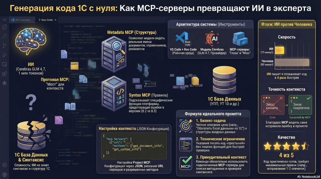Итог: Модель справилась на твердую четверку. Даже бесплатные инструменты при правильной настройке контекста через MCP позволяют автоматизировать рутину в 1С не хуже, чем многие платные аналоги.
