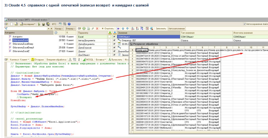 • Технические ограничения: Просьба писать код «простынёй» без лишних функций, чтобы его можно было сразу вставить в консоль кода 1С и выполнить - это для того, чтобы сразу проверить результат (хотя воспоминание из будущего - агенты могут генерить уже и полностью обработки с формами).