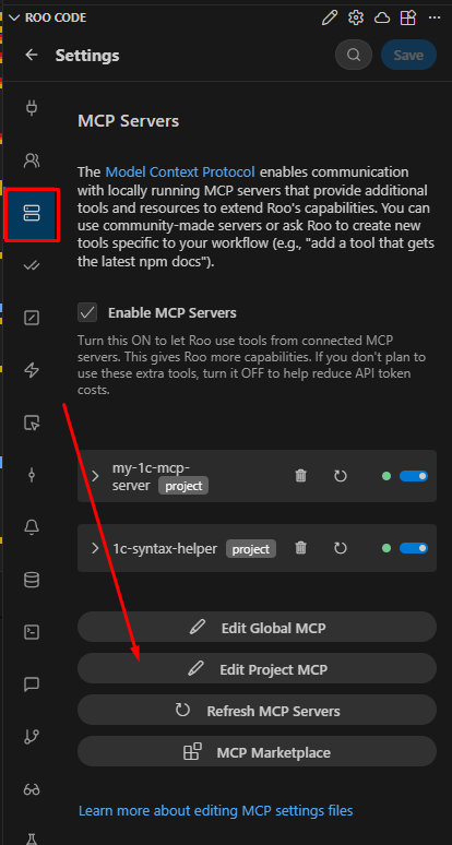 Переходим в настройки Roo Code, на третью сверху закладку "MCP Servers"