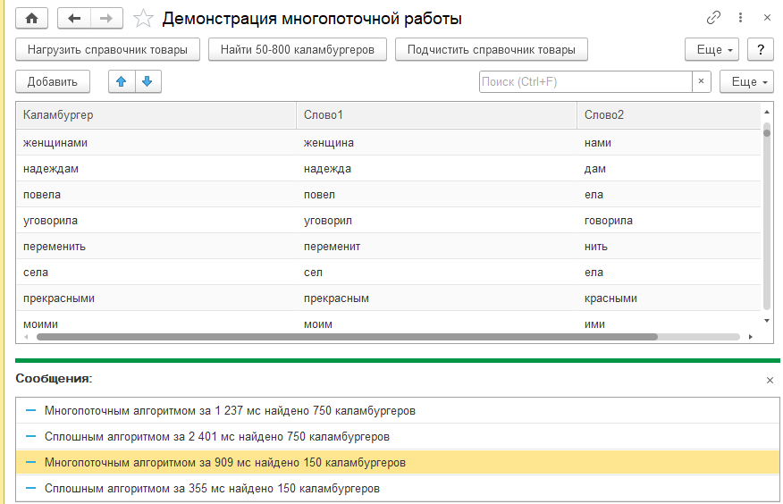 Первые две строчки мы собираем данные, вторыми запускаем конвейер, пятой строчкой сообщаем о результатах. Как видим, все очень и очень просто (было бы также с новыми функциями БСП для многопоточной работы, этой статьи бы не было). Не буду приводить здесь функцию обработки порции, она слишком простая (ищем в справочнике по слову в цикле, если такого слова еще нет, создаем элемент справочника). Если вам интересно, сколько уникальных слов в первых двух томах, то я вас не порадую, ибо данный алгоритм абсолютно не учитывает словоформы, да и разделители не все найдены точно. Так что их набралось более 30 тысяч, да.