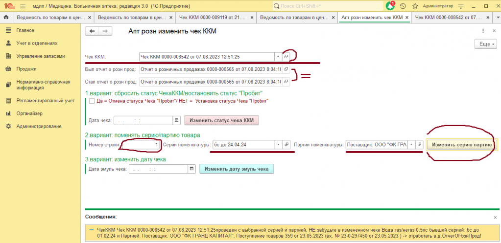чек ККМ отмена статуса чека ККМ розничные продажи Аптека пересортица товаров пересорт Серия товара Партия товара Вид номенклатуры ОФД МДЛП Честный знак Себестоимость Свободные остатки эмулятор ККМ с эквайрингом ведомость по товарам лекарства свести отчет 1с.Аптека Больничная аптека
