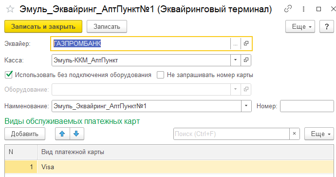 После установки драйвера эмулятора ККМ и привязки его к кассе ККМ, не забудьте про эквайринг создать: