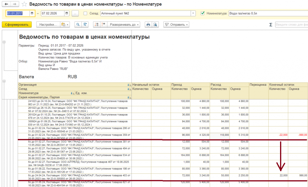 Из примера на скрине: мы как раз и видим подобную ситуацию: явная пересортица товара по серии и партии. Чеки пробиты, в ОФД ушли, в МДЛП - тоже что-то закрыто..Цена одинаковая.