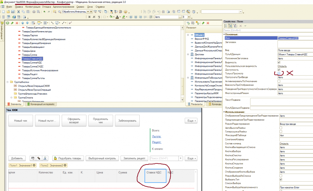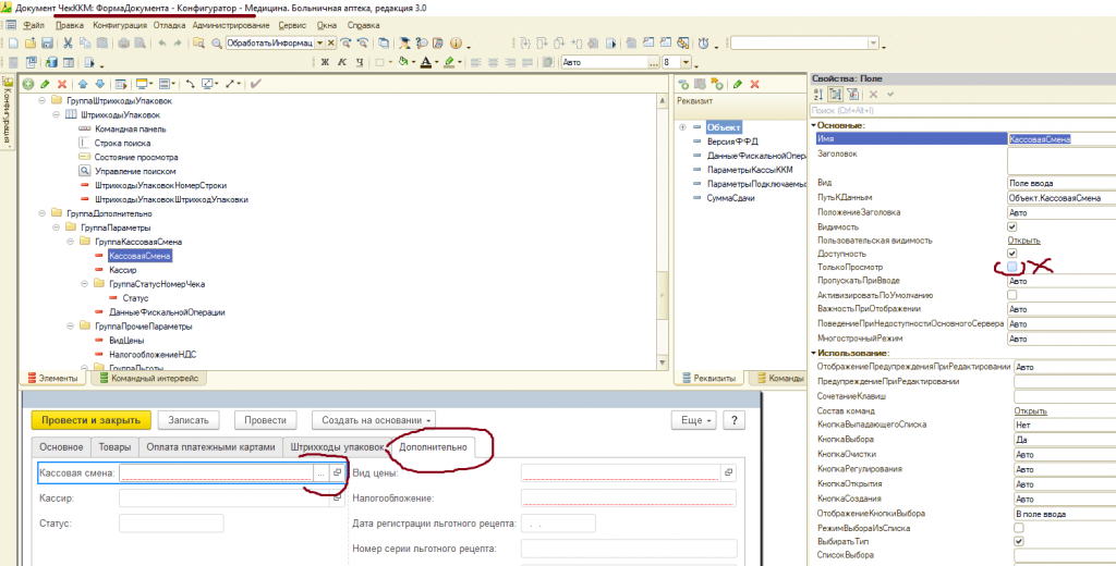 Изменение чека ККМ. 1С:Медицина. Больничная аптека