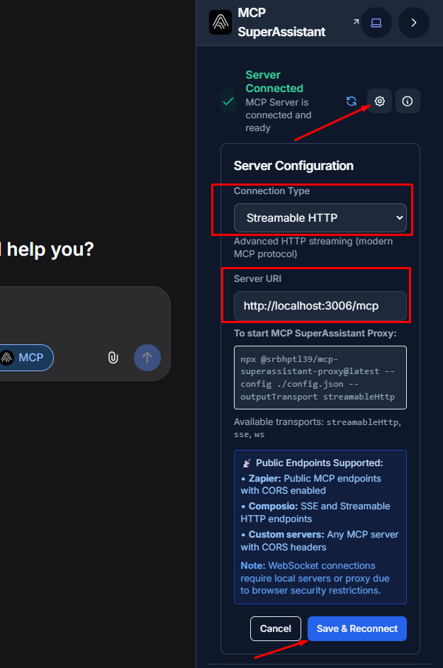 Чтобы браузерное расширение "увидело" ваши локальные сервера, нужно запустить связующее звено — MCP SuperAssistant Proxy.