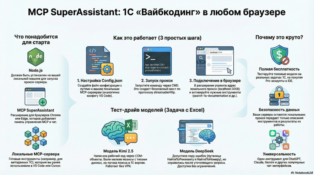 MCP SuperAssistant — это отличный способ бесплатно тестировать любые современные модели на ваших реальных задачах 1С. Вам не нужно ждать поддержки MCP в конкретной IDE или платить за Pro-аккаунты, чтобы попробовать.